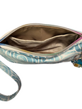 This super cute wristlet was created with the Clemantis pattern by Blue Calla (A Canadian Designer). Constructed with a swirl pattern themed waterproof upholstery fabric and blueberry faux leather, lined with nylon pack cloth and has cotton slip pocket and a wristlet strap. Includes custom made keychain bag charm.