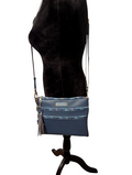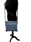Custom made crossbody bag made with Sallie Tomato's Zippy Bag pattern. Constructed with blueberry faux Leather, floral printed zippers, cotton pockets, and water resistant interior. Features 2 front pockets, 1 back pocket and water resistant main pouch. Bag measures 8.5 inches high by 10 inches wide.
