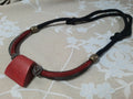 All materials were sourced in Japan. This necklace blends bold design with natural texture. A matte red wooden 1-inch pendant anchors the piece, framed by intricate knot detailing and a richly braided cord in deep red and charcoal tones. Soft brass-colored accent beads add warmth, while the adjustable black cord ensures a comfortable, versatile fit. Perfect for those who love statement jewelry with an artistic, organic edge. It pairs beautifully any wardrobe, adding depth and character to both casual and elevated looks. Cord length is 29 inches at the longest, and 20 inches at the shortest