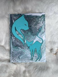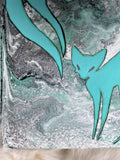 Silhouette of two cats turquoise surrounded with a swirling background. The background was created using an acrylic pour with black metallic, grey, turquoise and a hint of blue sparkle paints. As a cat lover I know how important it is to have two cats so that they can keep each other company. We are not home enough. This is my reminder of their importance in our lives. 5"x7" canvas painting