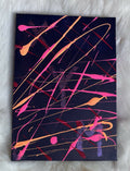 A deep purple background with runes in metallic red and splashes of red, pink neon and orange neon. The Runes in the background stand for Gift, Quest and Loyalty. My wish is for you to have a find loyalty, gifts and quests in your everyday life. 5x7 canvas