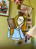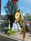 This handcrafted stained glass suncatcher is a perfect gift for avid readers. Its transparent glass design creates a stunning array of colors when illuminated by sunlight. Customize it further by adding the genre or title of a book of your choice, making it a truly personalized and cherished item for any book lover. Message me with your preferences, and I will bring your vision to life.