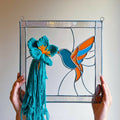 Handmade, one of a kind hummingbird panel with a macrame flower. Measures 12x12 and is the perfect collector piece. Created with opalescent and transparent clear/textured glass, this piece gives off a beautiful refraction.