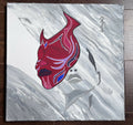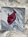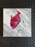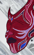 The Silhouette of a woman's face and a bright red decorated mask just above it. The entire painting is covered in a stream of grey and white light except where the mask is. This painting comes from what someone feels when they get home to a place where they can finally be fully at ease. When the mask comes off because there are no more judgements. It also has another meaning as well. Look at the detail that went into the mask. It took time, effort and thought. The person underneath though is all or nothing and something in between. The Runes mean Peace and Tranquility and Love. That is what I wish for your home. The painting is 12x12 canvas