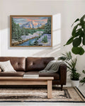 Capture the strength and quiet majesty of the Canadian Rockies with this original oil painting. At the heart of the composition rises a powerful snow-covered mountain, glowing in soft pink sunset light and standing tall above the winter forest.