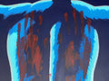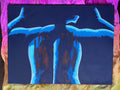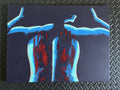 The back of a person with red hand prints dragged down the back. This is my interpretation of someone who is submitting to a Dom. The light reflects off their silhouette. I watch their mouth for sounds of joy, their chest for the skip in breath and their shoulders for the tension in the body. I concentrate the most on the movement of my own hands as they are my instruments to bring pleasure with pain. The red is for the pain that the body interprets as pleasure, hence the soothing light blue off the reflection. This painting is 25x18 canvas